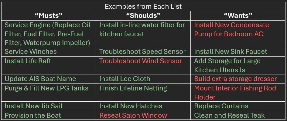 Well the day is finally here where we toss our lines, raise the sails, and point the bow north! When we first targeted July 11th as my last day of work and cast off shortly after, we created a list of items that “must be completed”, a list of what “should be completed”, and a list of “wants to be completed” as seen below. Note that items in GREEN we completed and items in RED are outstanding.
